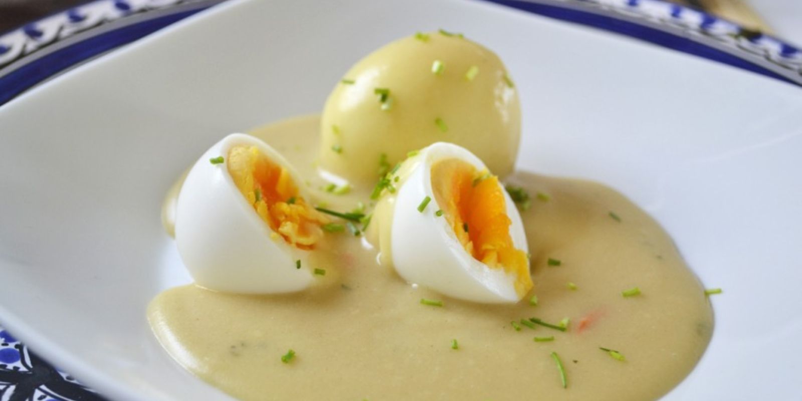 - Die gekochten Eier in dicke Scheiben schneiden und vorsichtig in die Senfsauce legen. Achten Sie darauf, dass die Eierscheiben gleichmäßig mit der Sauce bedeckt sind.